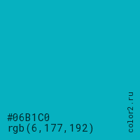 Цвет #06B1C0 в цветовой модели RGB обозначается тремя октетами (6, 177, 192) в десятичном формате и #06B1C0 в шестнадцатиричном (hex) формате, которые являются интенсивностью красного 6 (hex 06), интенсивность зелёного 177 (hex B1) и интенсивность синего 192 (hex C0).