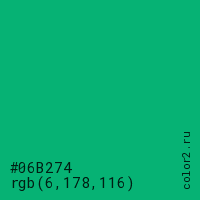 Цвет #06B274 в цветовой модели RGB обозначается тремя октетами (6, 178, 116) в десятичном формате и #06B274 в шестнадцатиричном (hex) формате, которые являются интенсивностью красного 6 (hex 06), интенсивность зелёного 178 (hex B2) и интенсивность синего 116 (hex 74).