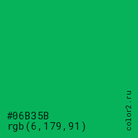 Цвет #06B35B в цветовой модели RGB обозначается тремя октетами (6, 179, 91) в десятичном формате и #06B35B в шестнадцатиричном (hex) формате, которые являются интенсивностью красного 6 (hex 06), интенсивность зелёного 179 (hex B3) и интенсивность синего 91 (hex 5B).