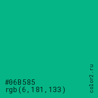 Цвет #06B585 в цветовой модели RGB обозначается тремя октетами (6, 181, 133) в десятичном формате и #06B585 в шестнадцатиричном (hex) формате, которые являются интенсивностью красного 6 (hex 06), интенсивность зелёного 181 (hex B5) и интенсивность синего 133 (hex 85).