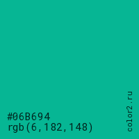 Цвет #06B694 в цветовой модели RGB обозначается тремя октетами (6, 182, 148) в десятичном формате и #06B694 в шестнадцатиричном (hex) формате, которые являются интенсивностью красного 6 (hex 06), интенсивность зелёного 182 (hex B6) и интенсивность синего 148 (hex 94).