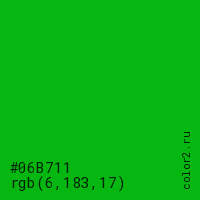 Цвет #06B711 в цветовой модели RGB обозначается тремя октетами (6, 183, 17) в десятичном формате и #06B711 в шестнадцатиричном (hex) формате, которые являются интенсивностью красного 6 (hex 06), интенсивность зелёного 183 (hex B7) и интенсивность синего 17 (hex 11).