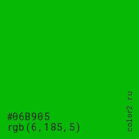 Цвет #06B905 в цветовой модели RGB обозначается тремя октетами (6, 185, 5) в десятичном формате и #06B905 в шестнадцатиричном (hex) формате, которые являются интенсивностью красного 6 (hex 06), интенсивность зелёного 185 (hex B9) и интенсивность синего 5 (hex 05).