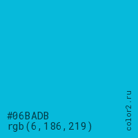 Цвет #06BADB в цветовой модели RGB обозначается тремя октетами (6, 186, 219) в десятичном формате и #06BADB в шестнадцатиричном (hex) формате, которые являются интенсивностью красного 6 (hex 06), интенсивность зелёного 186 (hex BA) и интенсивность синего 219 (hex DB).