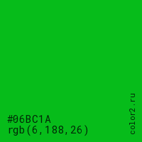 Цвет #06BC1A в цветовой модели RGB обозначается тремя октетами (6, 188, 26) в десятичном формате и #06BC1A в шестнадцатиричном (hex) формате, которые являются интенсивностью красного 6 (hex 06), интенсивность зелёного 188 (hex BC) и интенсивность синего 26 (hex 1A).