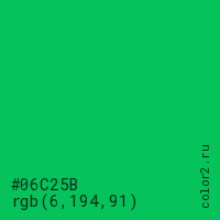 Цвет #06C25B в цветовой модели RGB обозначается тремя октетами (6, 194, 91) в десятичном формате и #06C25B в шестнадцатиричном (hex) формате, которые являются интенсивностью красного 6 (hex 06), интенсивность зелёного 194 (hex C2) и интенсивность синего 91 (hex 5B).