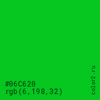 Цвет #06C620 в цветовой модели RGB обозначается тремя октетами (6, 198, 32) в десятичном формате и #06C620 в шестнадцатиричном (hex) формате, которые являются интенсивностью красного 6 (hex 06), интенсивность зелёного 198 (hex C6) и интенсивность синего 32 (hex 20).