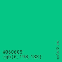 Цвет #06C685 в цветовой модели RGB обозначается тремя октетами (6, 198, 133) в десятичном формате и #06C685 в шестнадцатиричном (hex) формате, которые являются интенсивностью красного 6 (hex 06), интенсивность зелёного 198 (hex C6) и интенсивность синего 133 (hex 85).