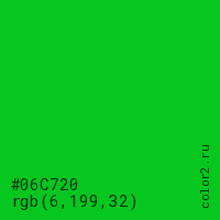 Цвет #06C720 в цветовой модели RGB обозначается тремя октетами (6, 199, 32) в десятичном формате и #06C720 в шестнадцатиричном (hex) формате, которые являются интенсивностью красного 6 (hex 06), интенсивность зелёного 199 (hex C7) и интенсивность синего 32 (hex 20).