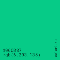 Цвет #06CB87 в цветовой модели RGB обозначается тремя октетами (6, 203, 135) в десятичном формате и #06CB87 в шестнадцатиричном (hex) формате, которые являются интенсивностью красного 6 (hex 06), интенсивность зелёного 203 (hex CB) и интенсивность синего 135 (hex 87).