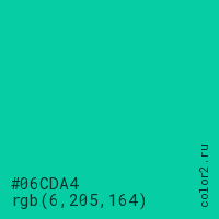 Цвет #06CDA4 в цветовой модели RGB обозначается тремя октетами (6, 205, 164) в десятичном формате и #06CDA4 в шестнадцатиричном (hex) формате, которые являются интенсивностью красного 6 (hex 06), интенсивность зелёного 205 (hex CD) и интенсивность синего 164 (hex A4).