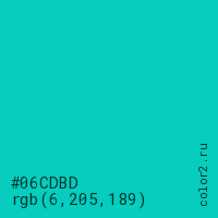 Цвет #06CDBD в цветовой модели RGB обозначается тремя октетами (6, 205, 189) в десятичном формате и #06CDBD в шестнадцатиричном (hex) формате, которые являются интенсивностью красного 6 (hex 06), интенсивность зелёного 205 (hex CD) и интенсивность синего 189 (hex BD).
