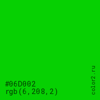 Цвет #06D002 в цветовой модели RGB обозначается тремя октетами (6, 208, 2) в десятичном формате и #06D002 в шестнадцатиричном (hex) формате, которые являются интенсивностью красного 6 (hex 06), интенсивность зелёного 208 (hex D0) и интенсивность синего 2 (hex 02).