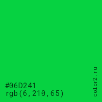 Цвет #06D241 в цветовой модели RGB обозначается тремя октетами (6, 210, 65) в десятичном формате и #06D241 в шестнадцатиричном (hex) формате, которые являются интенсивностью красного 6 (hex 06), интенсивность зелёного 210 (hex D2) и интенсивность синего 65 (hex 41).