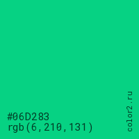 Цвет #06D283 в цветовой модели RGB обозначается тремя октетами (6, 210, 131) в десятичном формате и #06D283 в шестнадцатиричном (hex) формате, которые являются интенсивностью красного 6 (hex 06), интенсивность зелёного 210 (hex D2) и интенсивность синего 131 (hex 83).