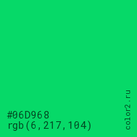 Цвет #06D968 в цветовой модели RGB обозначается тремя октетами (6, 217, 104) в десятичном формате и #06D968 в шестнадцатиричном (hex) формате, которые являются интенсивностью красного 6 (hex 06), интенсивность зелёного 217 (hex D9) и интенсивность синего 104 (hex 68).