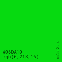 Цвет #06DA10 в цветовой модели RGB обозначается тремя октетами (6, 218, 16) в десятичном формате и #06DA10 в шестнадцатиричном (hex) формате, которые являются интенсивностью красного 6 (hex 06), интенсивность зелёного 218 (hex DA) и интенсивность синего 16 (hex 10).