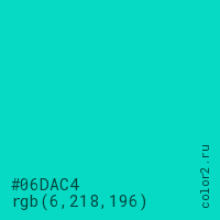 Цвет #06DAC4 в цветовой модели RGB обозначается тремя октетами (6, 218, 196) в десятичном формате и #06DAC4 в шестнадцатиричном (hex) формате, которые являются интенсивностью красного 6 (hex 06), интенсивность зелёного 218 (hex DA) и интенсивность синего 196 (hex C4).