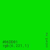 Цвет #06DD01 в цветовой модели RGB обозначается тремя октетами (6, 221, 1) в десятичном формате и #06DD01 в шестнадцатиричном (hex) формате, которые являются интенсивностью красного 6 (hex 06), интенсивность зелёного 221 (hex DD) и интенсивность синего 1 (hex 01).
