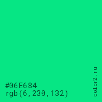 Цвет #06E684 в цветовой модели RGB обозначается тремя октетами (6, 230, 132) в десятичном формате и #06E684 в шестнадцатиричном (hex) формате, которые являются интенсивностью красного 6 (hex 06), интенсивность зелёного 230 (hex E6) и интенсивность синего 132 (hex 84).