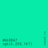 Цвет #06EBA7 в цветовой модели RGB обозначается тремя октетами (6, 235, 167) в десятичном формате и #06EBA7 в шестнадцатиричном (hex) формате, которые являются интенсивностью красного 6 (hex 06), интенсивность зелёного 235 (hex EB) и интенсивность синего 167 (hex A7).
