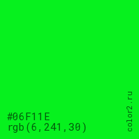 Цвет #06F11E в цветовой модели RGB обозначается тремя октетами (6, 241, 30) в десятичном формате и #06F11E в шестнадцатиричном (hex) формате, которые являются интенсивностью красного 6 (hex 06), интенсивность зелёного 241 (hex F1) и интенсивность синего 30 (hex 1E).