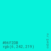 Цвет #06F2DB в цветовой модели RGB обозначается тремя октетами (6, 242, 219) в десятичном формате и #06F2DB в шестнадцатиричном (hex) формате, которые являются интенсивностью красного 6 (hex 06), интенсивность зелёного 242 (hex F2) и интенсивность синего 219 (hex DB).