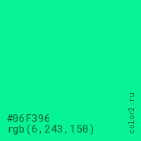 Цвет #06F396 в цветовой модели RGB обозначается тремя октетами (6, 243, 150) в десятичном формате и #06F396 в шестнадцатиричном (hex) формате, которые являются интенсивностью красного 6 (hex 06), интенсивность зелёного 243 (hex F3) и интенсивность синего 150 (hex 96).
