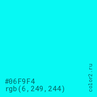Цвет #06F9F4 в цветовой модели RGB обозначается тремя октетами (6, 249, 244) в десятичном формате и #06F9F4 в шестнадцатиричном (hex) формате, которые являются интенсивностью красного 6 (hex 06), интенсивность зелёного 249 (hex F9) и интенсивность синего 244 (hex F4).