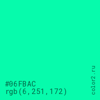 Цвет #06FBAC в цветовой модели RGB обозначается тремя октетами (6, 251, 172) в десятичном формате и #06FBAC в шестнадцатиричном (hex) формате, которые являются интенсивностью красного 6 (hex 06), интенсивность зелёного 251 (hex FB) и интенсивность синего 172 (hex AC).