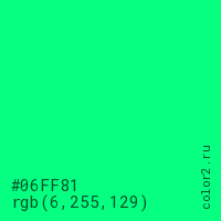 Цвет #06FF81 в цветовой модели RGB обозначается тремя октетами (6, 255, 129) в десятичном формате и #06FF81 в шестнадцатиричном (hex) формате, которые являются интенсивностью красного 6 (hex 06), интенсивность зелёного 255 (hex FF) и интенсивность синего 129 (hex 81).