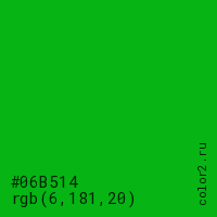Цвет #06B514 в цветовой модели RGB обозначается тремя октетами (6, 181, 20) в десятичном формате и #06B514 в шестнадцатиричном (hex) формате, которые являются интенсивностью красного 6 (hex 06), интенсивность зелёного 181 (hex B5) и интенсивность синего 20 (hex 14).