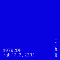 Цвет #0702DF в цветовой модели RGB обозначается тремя октетами (7, 2, 223) в десятичном формате и #0702DF в шестнадцатиричном (hex) формате, которые являются интенсивностью красного 7 (hex 07), интенсивность зелёного 2 (hex 02) и интенсивность синего 223 (hex DF).