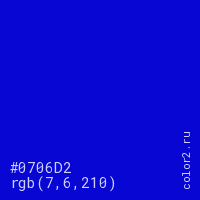 Цвет #0706D2 в цветовой модели RGB обозначается тремя октетами (7, 6, 210) в десятичном формате и #0706D2 в шестнадцатиричном (hex) формате, которые являются интенсивностью красного 7 (hex 07), интенсивность зелёного 6 (hex 06) и интенсивность синего 210 (hex D2).