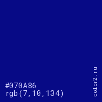 Цвет #070A86 в цветовой модели RGB обозначается тремя октетами (7, 10, 134) в десятичном формате и #070A86 в шестнадцатиричном (hex) формате, которые являются интенсивностью красного 7 (hex 07), интенсивность зелёного 10 (hex 0A) и интенсивность синего 134 (hex 86).