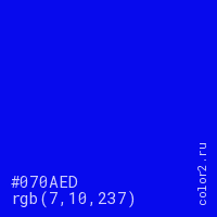 Цвет #070AED в цветовой модели RGB обозначается тремя октетами (7, 10, 237) в десятичном формате и #070AED в шестнадцатиричном (hex) формате, которые являются интенсивностью красного 7 (hex 07), интенсивность зелёного 10 (hex 0A) и интенсивность синего 237 (hex ED).