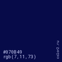 Цвет #070B49 в цветовой модели RGB обозначается тремя октетами (7, 11, 73) в десятичном формате и #070B49 в шестнадцатиричном (hex) формате, которые являются интенсивностью красного 7 (hex 07), интенсивность зелёного 11 (hex 0B) и интенсивность синего 73 (hex 49).