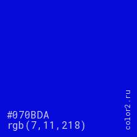 Цвет #070BDA в цветовой модели RGB обозначается тремя октетами (7, 11, 218) в десятичном формате и #070BDA в шестнадцатиричном (hex) формате, которые являются интенсивностью красного 7 (hex 07), интенсивность зелёного 11 (hex 0B) и интенсивность синего 218 (hex DA).