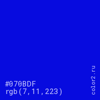 Цвет #070BDF в цветовой модели RGB обозначается тремя октетами (7, 11, 223) в десятичном формате и #070BDF в шестнадцатиричном (hex) формате, которые являются интенсивностью красного 7 (hex 07), интенсивность зелёного 11 (hex 0B) и интенсивность синего 223 (hex DF).