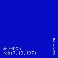 Цвет #070DC5 в цветовой модели RGB обозначается тремя октетами (7, 13, 197) в десятичном формате и #070DC5 в шестнадцатиричном (hex) формате, которые являются интенсивностью красного 7 (hex 07), интенсивность зелёного 13 (hex 0D) и интенсивность синего 197 (hex C5).