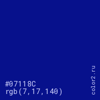 Цвет #07118C в цветовой модели RGB обозначается тремя октетами (7, 17, 140) в десятичном формате и #07118C в шестнадцатиричном (hex) формате, которые являются интенсивностью красного 7 (hex 07), интенсивность зелёного 17 (hex 11) и интенсивность синего 140 (hex 8C).