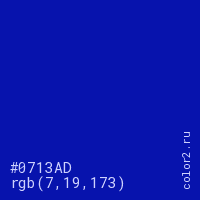 Цвет #0713AD в цветовой модели RGB обозначается тремя октетами (7, 19, 173) в десятичном формате и #0713AD в шестнадцатиричном (hex) формате, которые являются интенсивностью красного 7 (hex 07), интенсивность зелёного 19 (hex 13) и интенсивность синего 173 (hex AD).