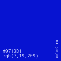 Цвет #0713D1 в цветовой модели RGB обозначается тремя октетами (7, 19, 209) в десятичном формате и #0713D1 в шестнадцатиричном (hex) формате, которые являются интенсивностью красного 7 (hex 07), интенсивность зелёного 19 (hex 13) и интенсивность синего 209 (hex D1).