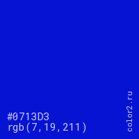 Цвет #0713D3 в цветовой модели RGB обозначается тремя октетами (7, 19, 211) в десятичном формате и #0713D3 в шестнадцатиричном (hex) формате, которые являются интенсивностью красного 7 (hex 07), интенсивность зелёного 19 (hex 13) и интенсивность синего 211 (hex D3).
