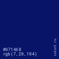 Цвет #071468 в цветовой модели RGB обозначается тремя октетами (7, 20, 104) в десятичном формате и #071468 в шестнадцатиричном (hex) формате, которые являются интенсивностью красного 7 (hex 07), интенсивность зелёного 20 (hex 14) и интенсивность синего 104 (hex 68).