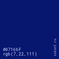 Цвет #07166F в цветовой модели RGB обозначается тремя октетами (7, 22, 111) в десятичном формате и #07166F в шестнадцатиричном (hex) формате, которые являются интенсивностью красного 7 (hex 07), интенсивность зелёного 22 (hex 16) и интенсивность синего 111 (hex 6F).