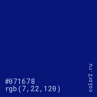 Цвет #071678 в цветовой модели RGB обозначается тремя октетами (7, 22, 120) в десятичном формате и #071678 в шестнадцатиричном (hex) формате, которые являются интенсивностью красного 7 (hex 07), интенсивность зелёного 22 (hex 16) и интенсивность синего 120 (hex 78).