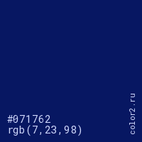 Цвет #071762 в цветовой модели RGB обозначается тремя октетами (7, 23, 98) в десятичном формате и #071762 в шестнадцатиричном (hex) формате, которые являются интенсивностью красного 7 (hex 07), интенсивность зелёного 23 (hex 17) и интенсивность синего 98 (hex 62).