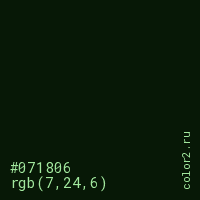 Цвет #071806 в цветовой модели RGB обозначается тремя октетами (7, 24, 6) в десятичном формате и #071806 в шестнадцатиричном (hex) формате, которые являются интенсивностью красного 7 (hex 07), интенсивность зелёного 24 (hex 18) и интенсивность синего 6 (hex 06).