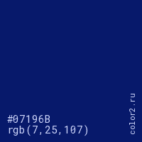 Цвет #07196B в цветовой модели RGB обозначается тремя октетами (7, 25, 107) в десятичном формате и #07196B в шестнадцатиричном (hex) формате, которые являются интенсивностью красного 7 (hex 07), интенсивность зелёного 25 (hex 19) и интенсивность синего 107 (hex 6B).